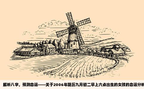 根据您所提供的信息,我们来为您的女儿批一个八字。您的女儿出生在2006年阴历九月初二早上六点,我们可以根据这个时间来推算她的八字。