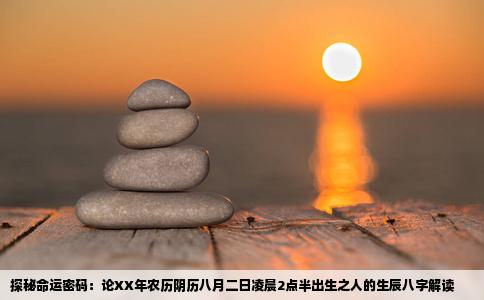 命理之道,博大精深。每一个生命降生于世,都有其独特的时空背景。而阴历生辰八字,则是揭示人生奥秘的钥匙之一。本文就为大家解析在农历XX年八月二日凌晨2点半出生之人的生辰八字背后的玄机。此人之八字以阴阳五行与十二生肖相结合,精确反映出天时、地利、人和的多重信息。此人在生辰的时刻,五行之中水木之旺,象征着...