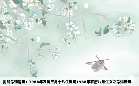 周易命理作为中华传统文化的重要一环,以天地万物的运行法则来探索人类命运的奥妙。其中,生辰八字是命理分析的基础。以下将从八字分析的角度,解析出生于1988年的男女二人(男生农历三月十八午时出生,女生农历八月具体日期缺失,这里按未提及具体月日作简要讨论)的命运走势。生辰八字的解析男生生于1988年农...
