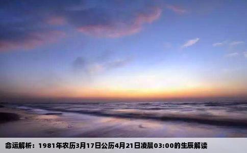 命运,一直以来都是人们探索和追求答案的课题。对于出生于1981年农历3月17日、公历4月21日凌晨03:00的人来说,他们的命运轨迹如何,又该如何解读呢?本文将通过八字命理、五行分析以及人生运势等方面,为您详细解析这一时辰出生者的命运特点。八字命理简述根据八字命理学,一个人的命运与出生年、月、日、时...