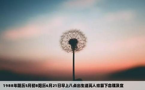 〖阳历〗:公元1988年6月21日〖阴历〗:农历戊辰龙年五月初八日星座幸运号码:2、11、20生肖五行:土幸运色彩:黄、紫、褐、红。幸运石:红玉髓、琥珀。您的生命数字是:【8】生命数字【8】的人:为了怕伤人常隐瞒真正情绪,爱情对他们来说是终生誓约概述:直觉很强,擅于洞察。