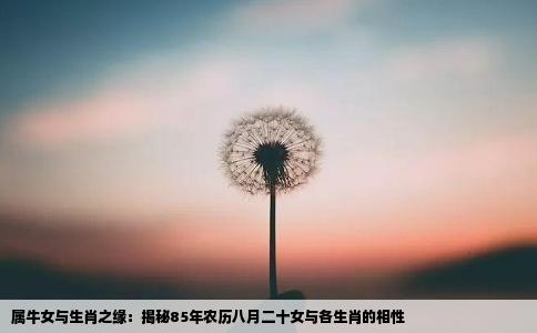 在中国传统命理学中,生肖相性一直是人们关注的焦点。对于1985年出生的女阴历八月二十的属牛人士来说,与何种生肖最为相配呢?下面,我们就来详细探讨这一问题。命理学认为人与人之间的相性,并非仅仅取决于生肖这一个因素,而是多种因素的综合作用。从生肖这一角度来看,属牛的人性格稳重、务实、忠诚,对待感情和家庭...