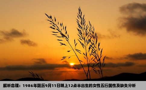 命理学在中国传统文化中占据重要地位,通过生辰八字可以推算出一个人的五行属性及缺失情况,进而了解其性格特征、命运走向及补救方法。本文将详细分析1986年阴历9月11日晚上12点半出生的女性的命理情况,探究其五行属性和缺失什么。生辰八字解析该女性出生于1986年阴历9月11日晚上12点半,根据农历干...