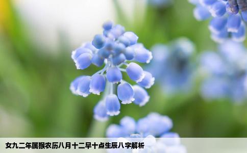 生辰八字,是中国传统文化中对人出生时的干支历日期进行推算得出的四组干支,即年柱、月柱、日柱、时柱。根据所给信息,女九二年属猴农历八月十二早十点生的生辰八字为:壬申年、庚申月、庚午日、癸巳时。生辰八字的构成生辰八字,依据天干、地支相配,反映了一个人出生时的天时地利。天干包括甲、乙、丙、丁、戊、己、庚、...