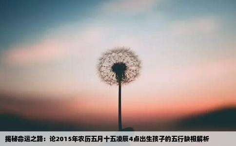 2015年是乙未羊年,农历五月十五是夏天初阳高挂的日子,而凌晨4点,是夜晚与白天的交替之际。在这一刻,一位新生儿来到了这个世界上。他的出生时间,在中华传统的五行理论中,与他的命运息息相关。这位在2015年农历五月十五凌辰4点出生的孩子,在五行中缺什么呢?根据五行理论,我们可以将这个孩子出生的时间进行...